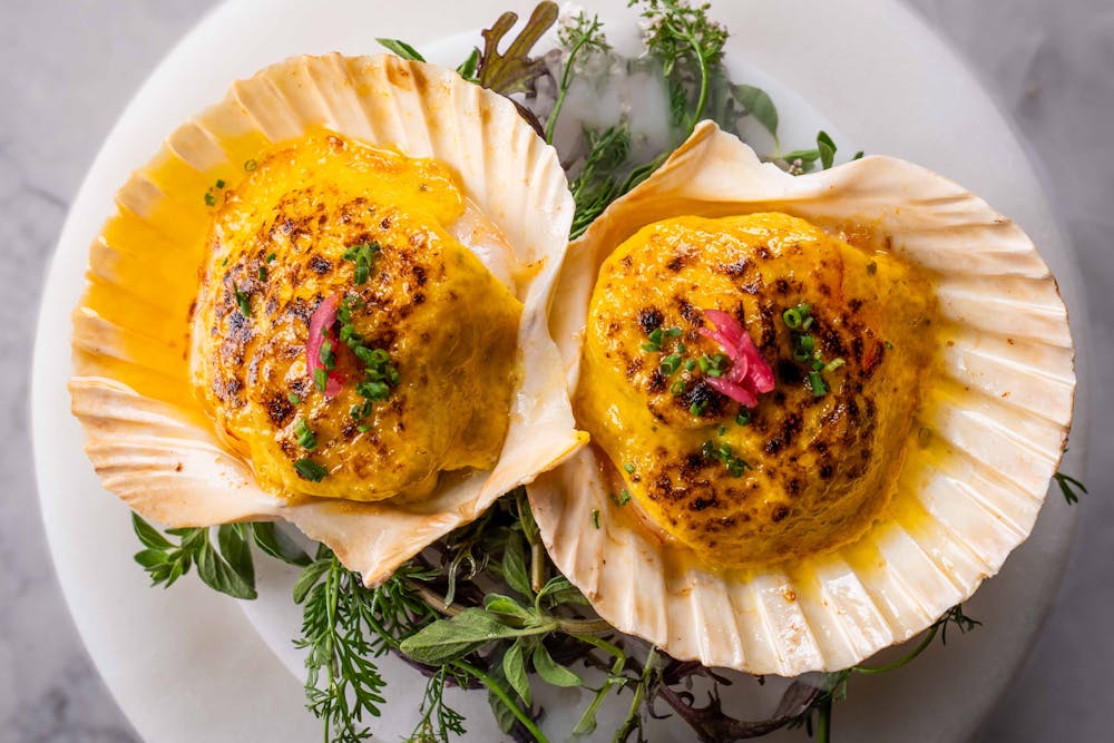 Baked Scallops "Dynamite": A gluten-free delight that marries the ocean's bounty. Scallops are baked to perfection alongside shrimp, mushrooms, pearl onion, and yuzu kosho aioli. Perfect if you're in the mood for a creamy and zesty start to your meal.
